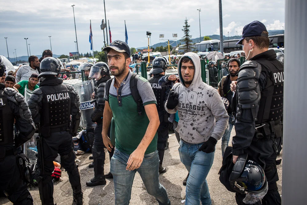 Lassés d’attendre les cars, des réfugiés décident de quitter Tovarnik à pied. Ils sont interceptés par des policiers qui tentent de les convaincre de retourner au village.