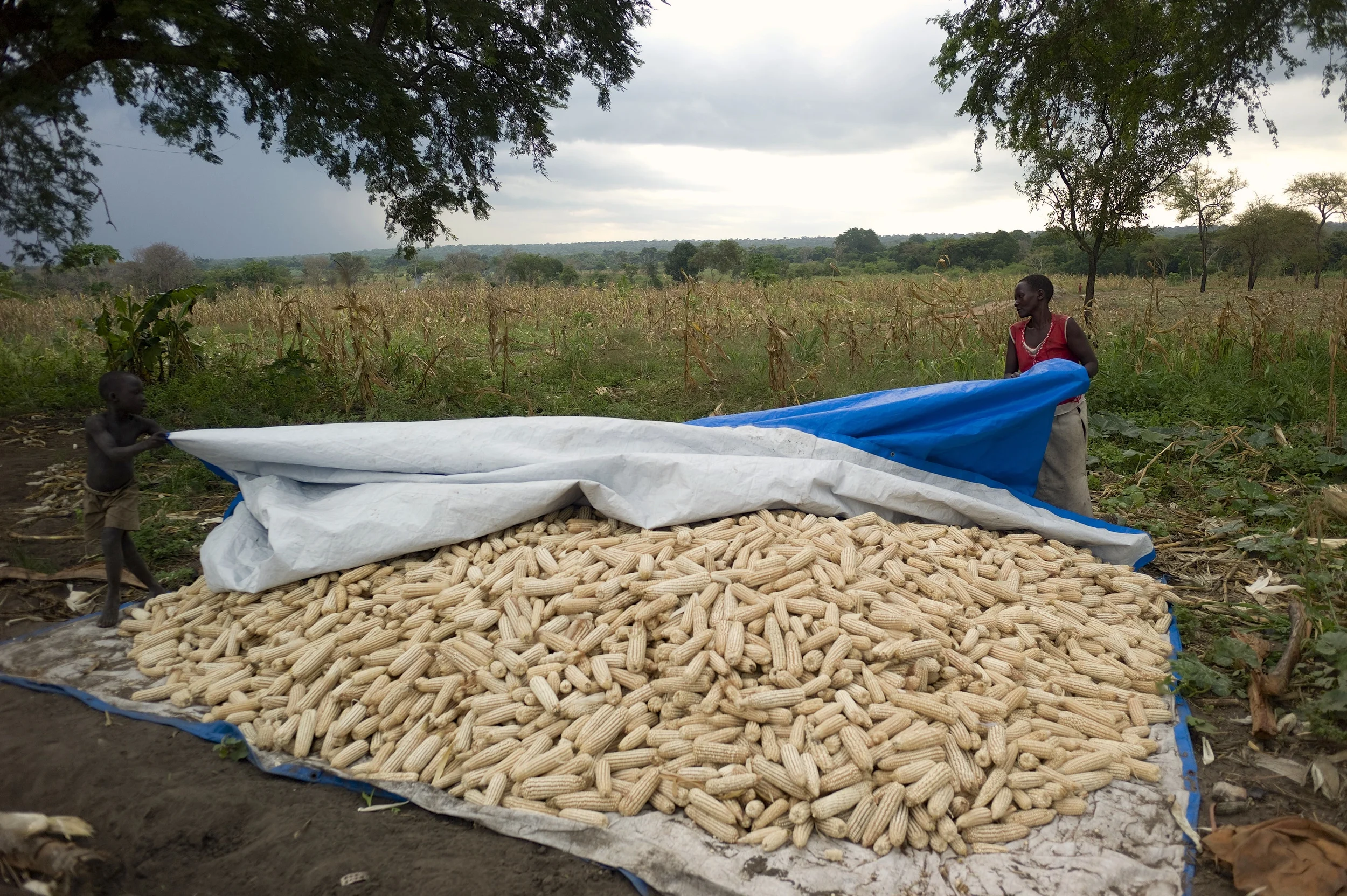 Timo, 9, helps his mother, Pacoryema Joyce, cover maize with a tarp in Obira village. The hidden costs of schooling are too high for parents in the Acholi region. Children are an invaluable source of labour for households trying to make ends meet.