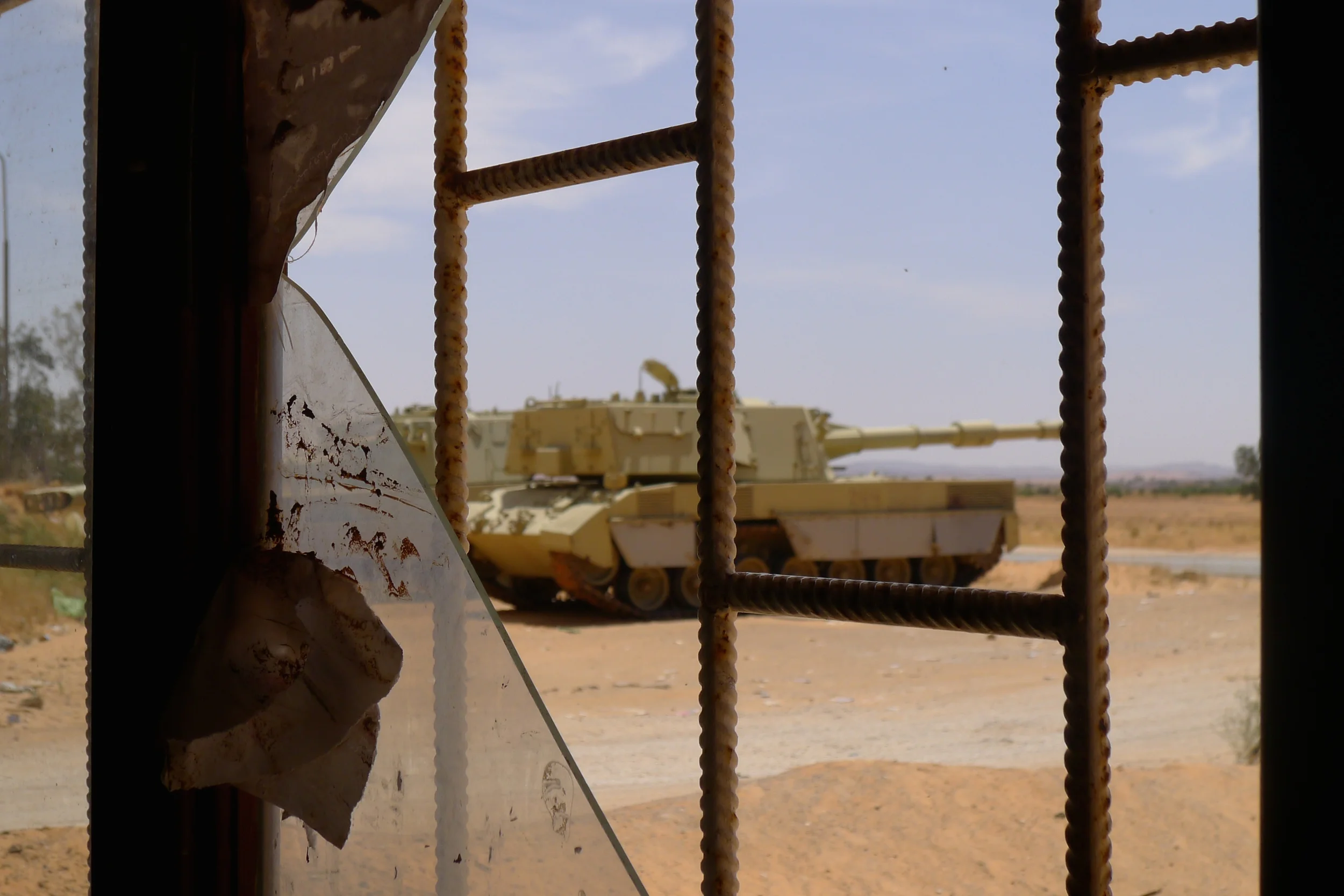 From the window of the main classroom, a jagged piece of broken glass framed a view of two tanks parked outside. Militias stored the tanks and large quantities of weapons on the edge of the camp one month ago, said residents, who are afraid the presence of weapons and ammunition could now make the camp a target.
