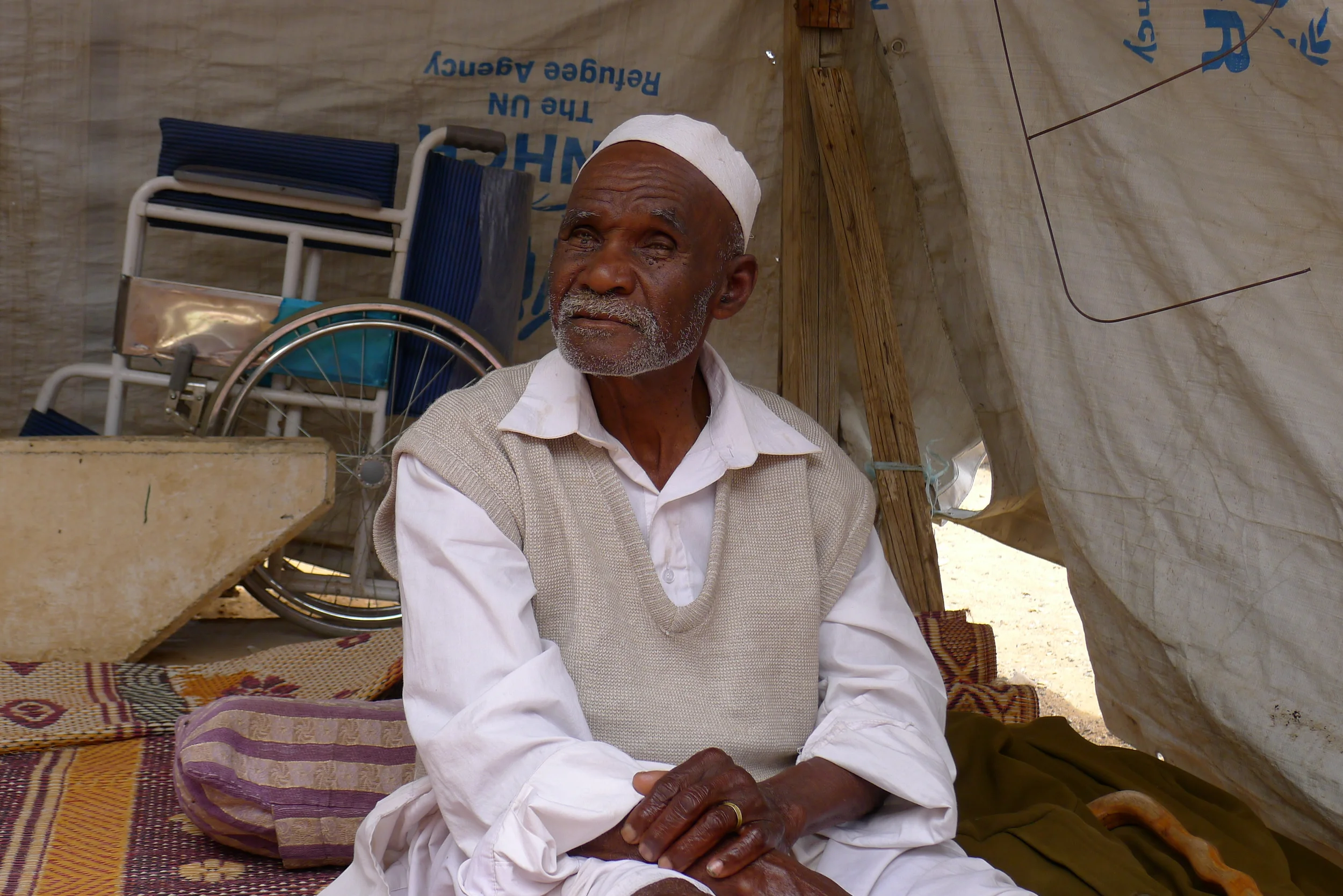 Sitting on matting under awning made from an old tarpaulin, 86-year-old Houssain rubbed oil into his withered knees, the only relief he has from the pain in his joints.