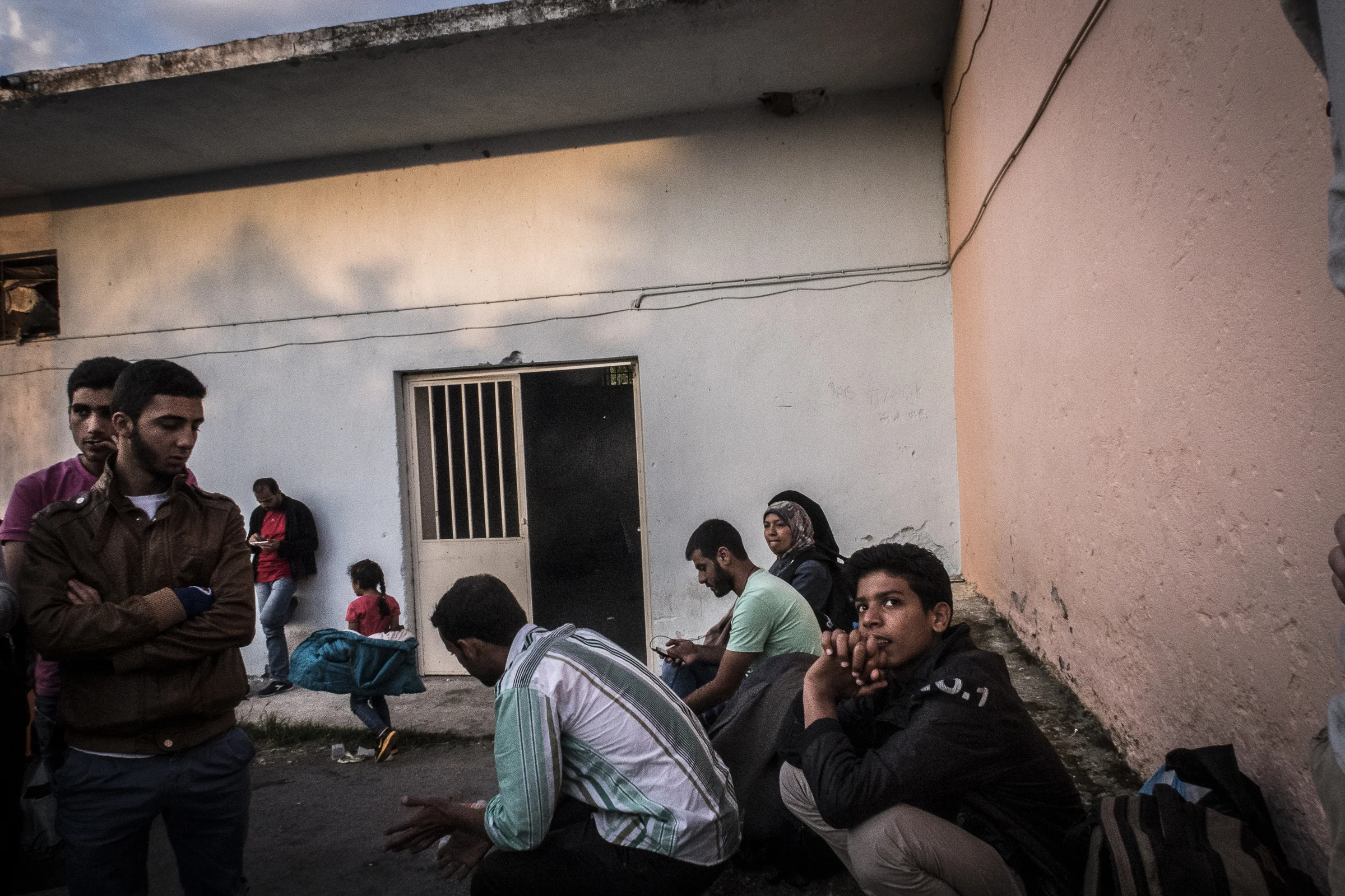 A group of migrants caught by the Greek police get ready for a night at a police station near the border. They will be released the next morning.