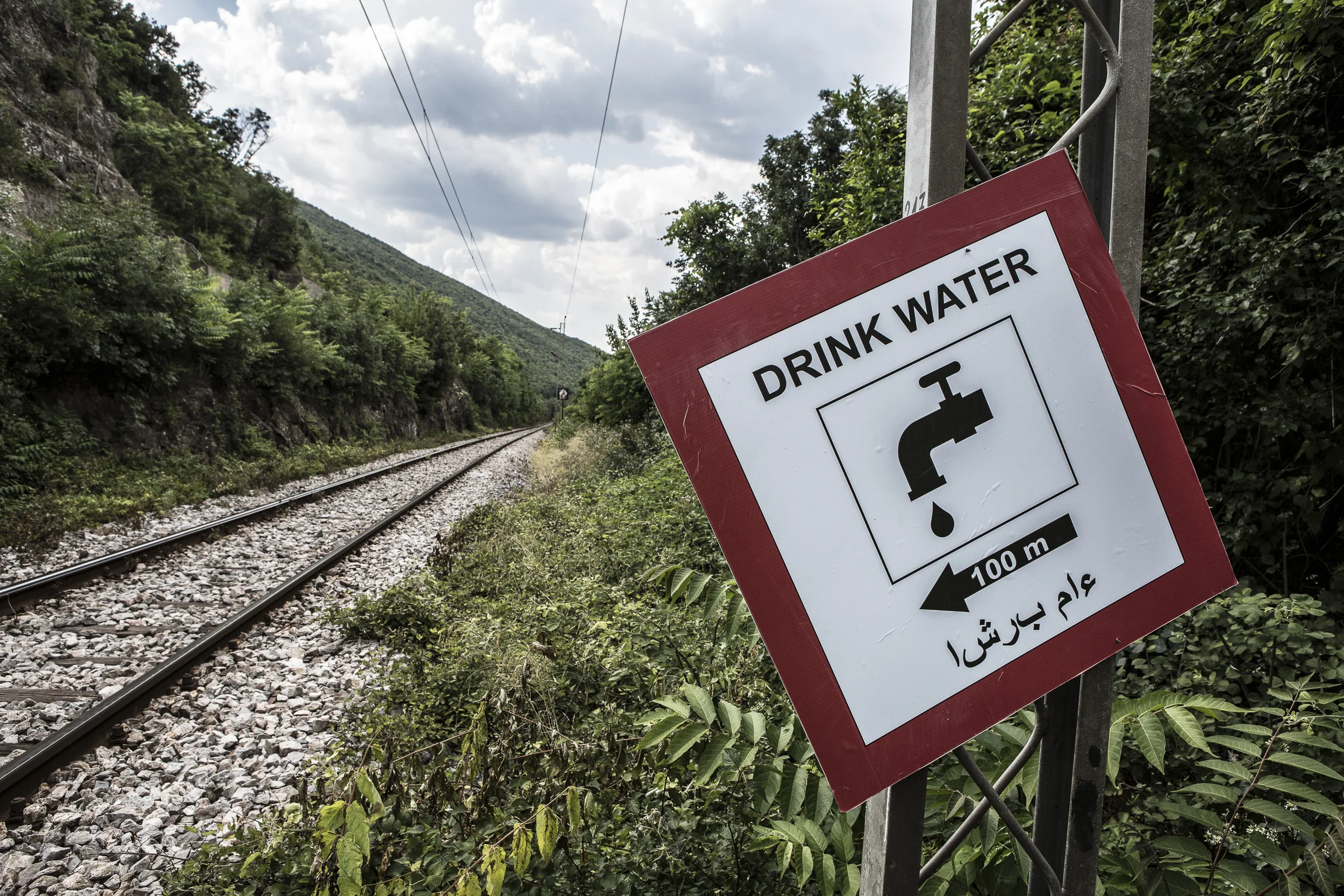One of the 60 signs that a Macedonian man has put up along the railway line warning migrants of the dangers and directing them to water fountains.
