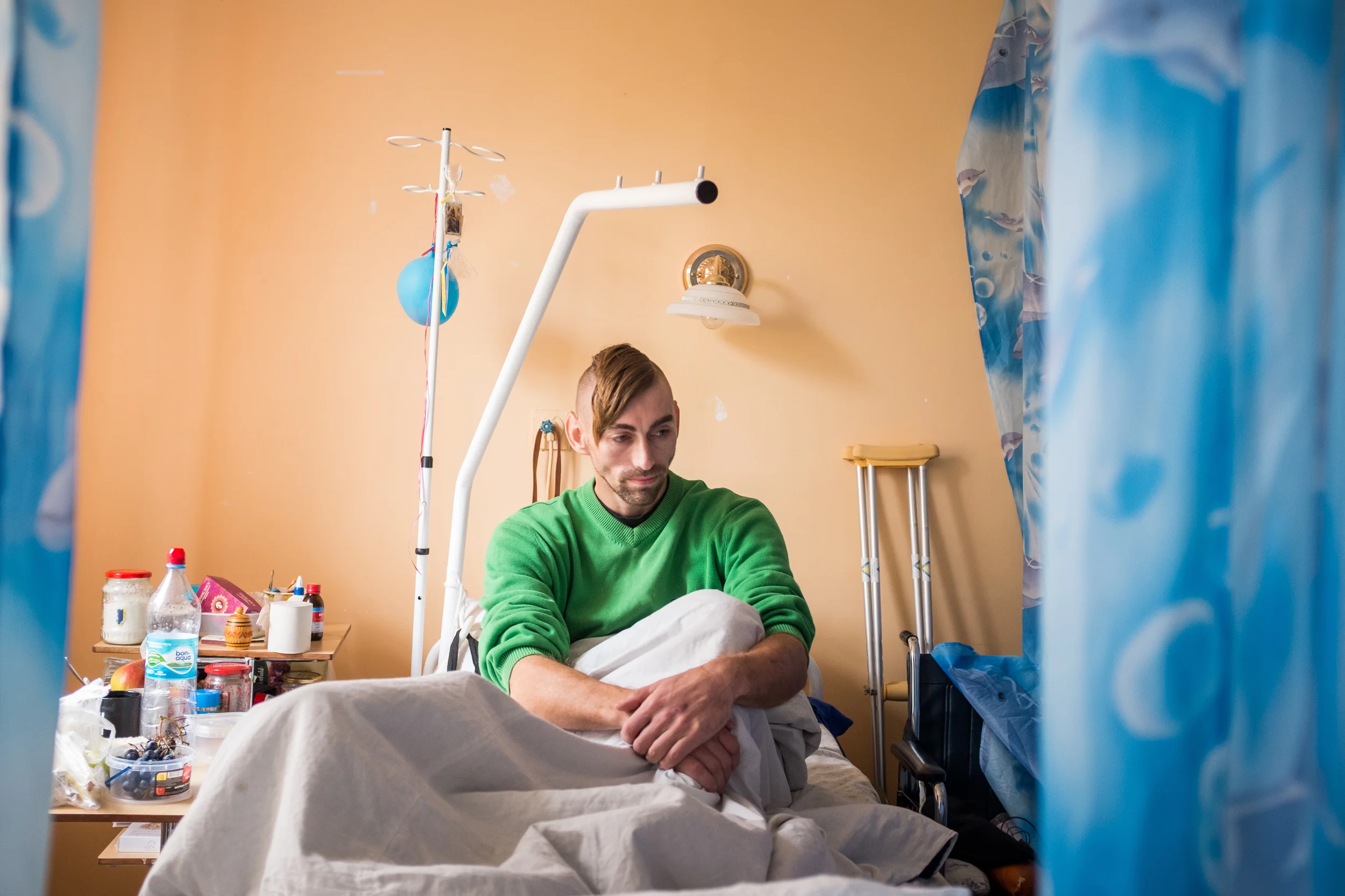 A soldier lies in bed in a military hospital in Kiev, where he is being treated for an injury to his leg that he has received while fighting on the frontline in the east.