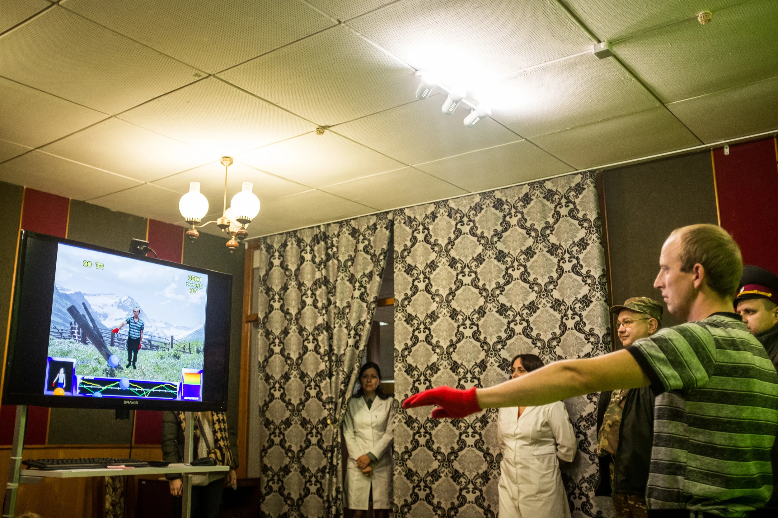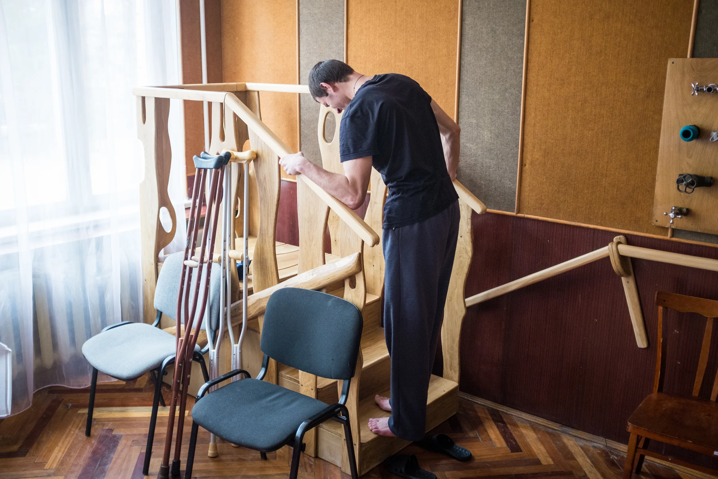 At the Irpin military hospital, outside Kiev, a patient uses the Interactive Virtual Reality Exercise System to improve control of his movements. The hospital is the most advanced centre for physical and psychological rehabilitation in Ukraine.