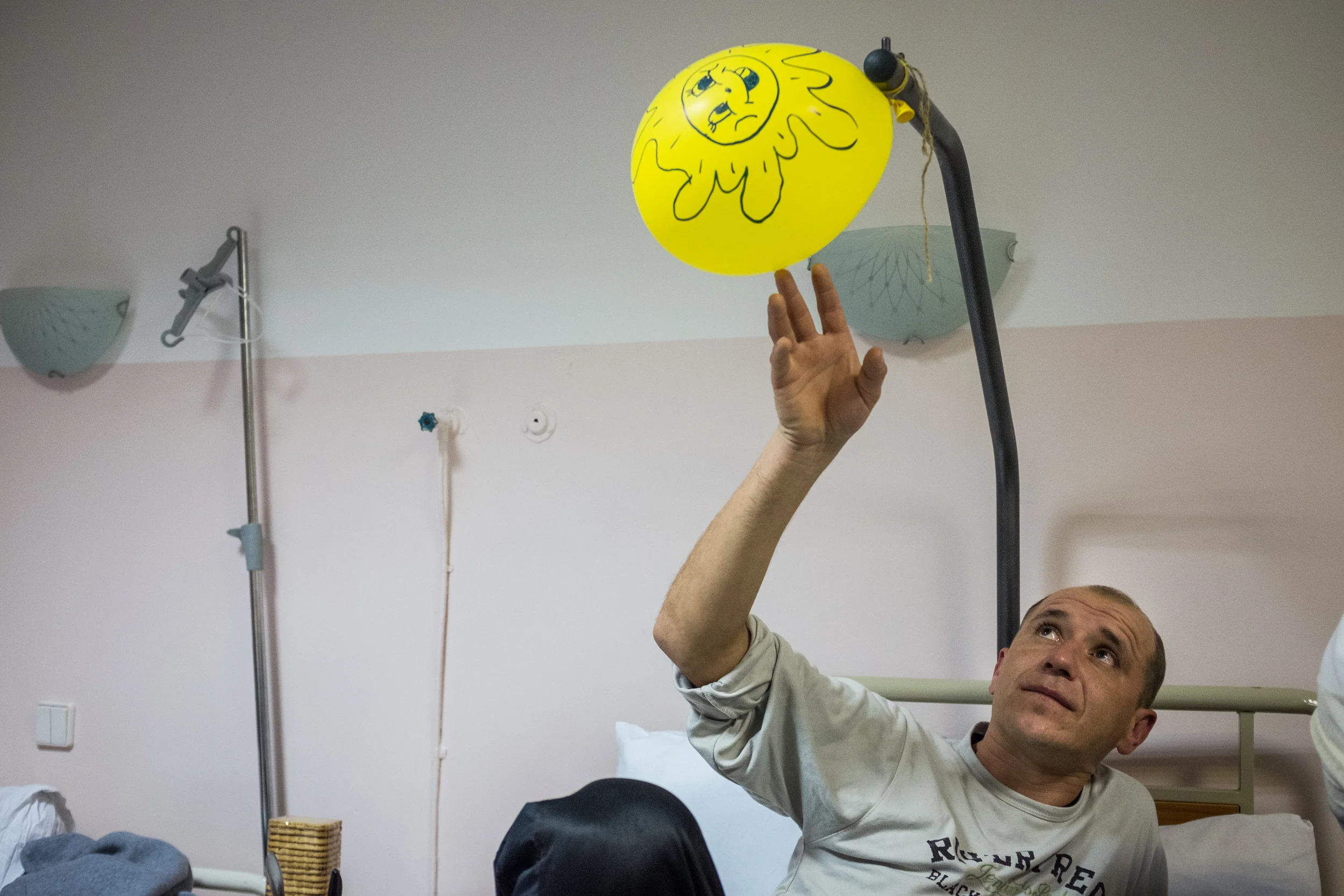 A wounded soldier plays with a balloon in his bed in Kiev's central military hospital. Many soldiers who have been wounded say do not trust psychologists, because they have not witnessed the war first-hand.