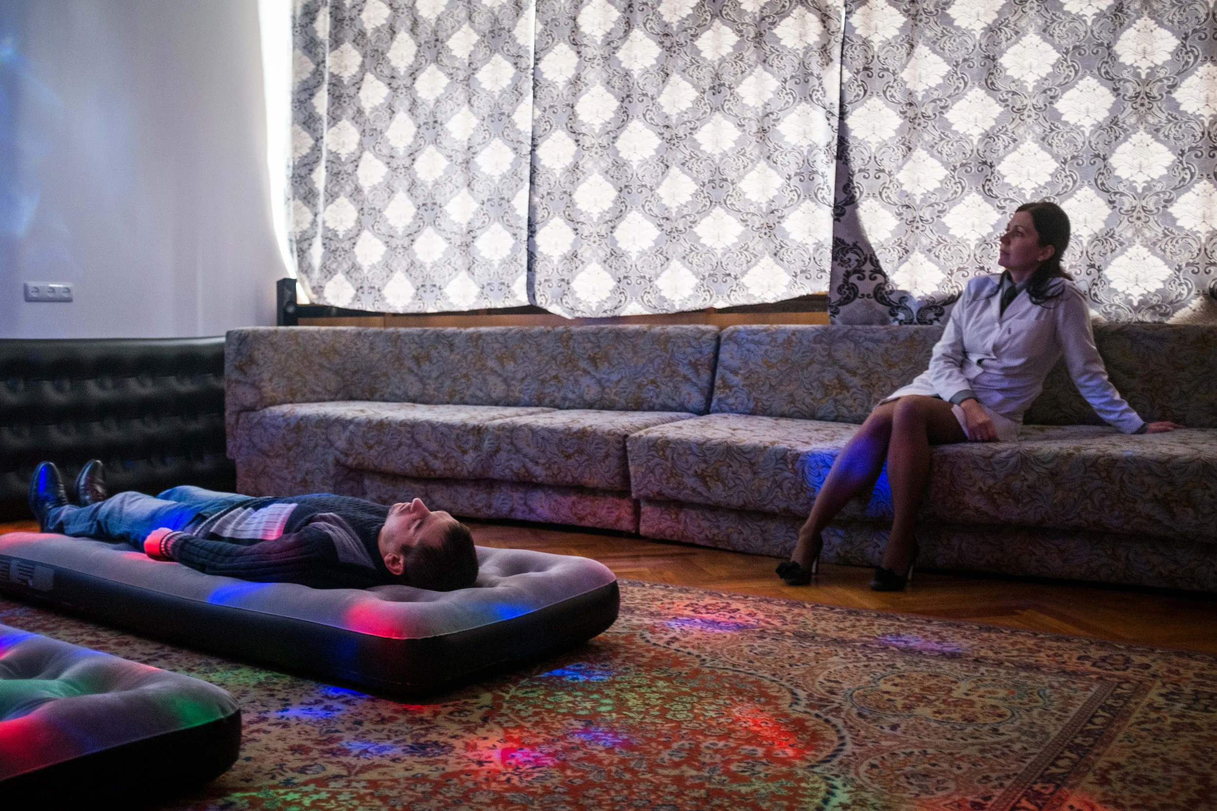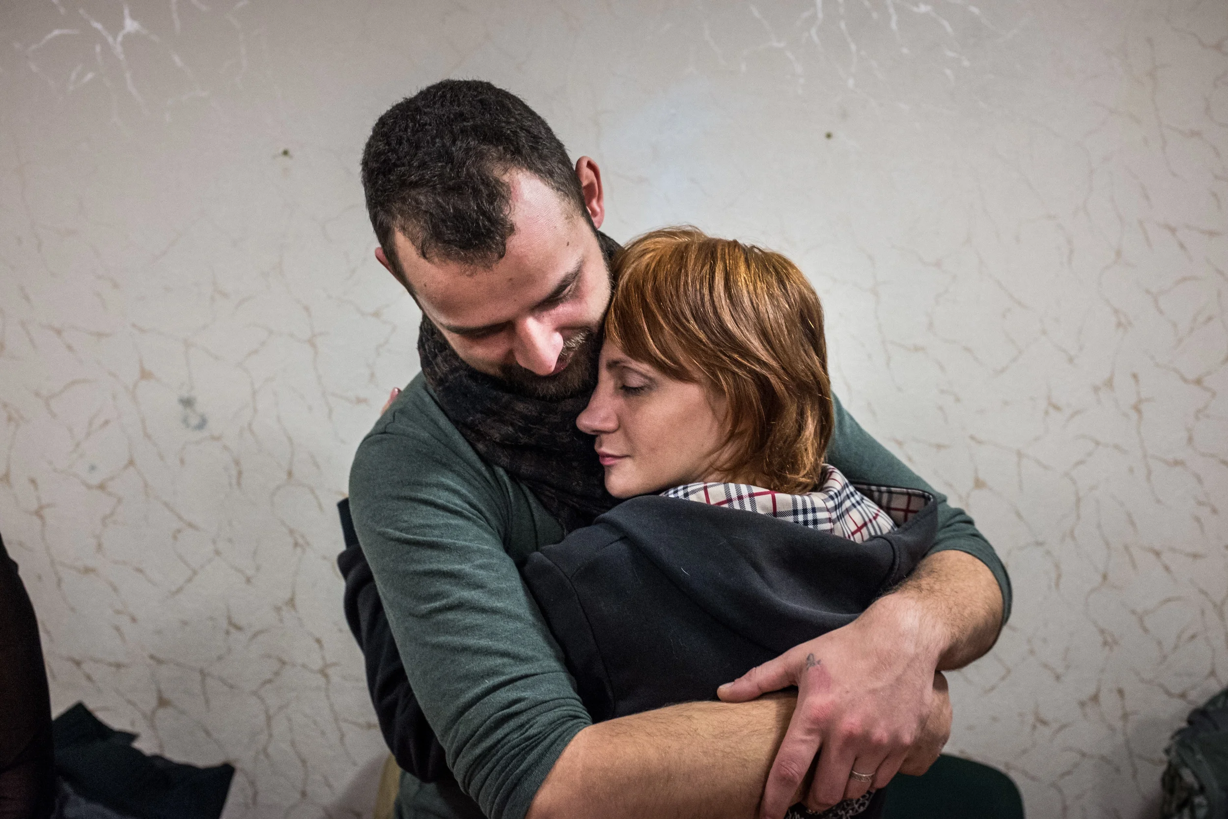 Pavel and Natalya embrace during the workshop. He is a Russian soldier from Moscow who has joined the Ukrainian forces to fight the pro-Russian rebels in the east. Natalya is a volunteer who has helped Ukrainian forces on the frontline.