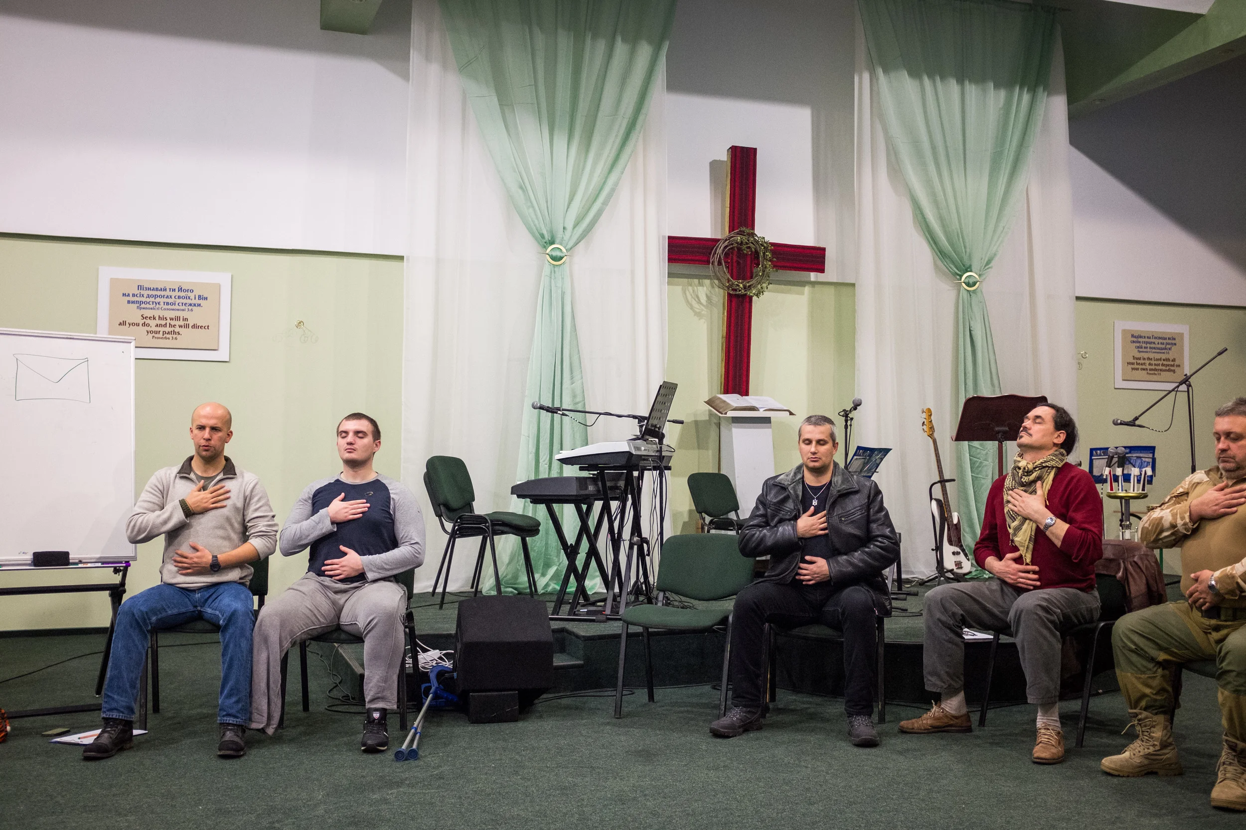 Oleh Hukovskyy, first from the left, a psychiatrist and psychotherapist, leads the Wounded Warrior Ukraine workshop. The purpose of these seminars is to train Ukrainian veterans to become instructors and helps other soldiers understand and fight PTSD.
